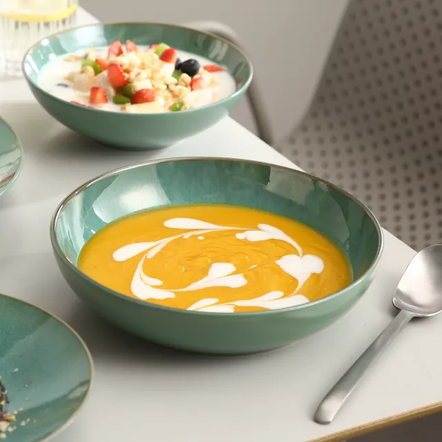 Each piece is crafted from high-quality stoneware and fired at high temperatures for strength and durability. The softly irregular edges and embossed surface create a natural, artisanal feel, while the smooth glaze makes cleaning easy. The calming green color pairs beautifully with both light and dark table settings, allowing you to style your table your way.