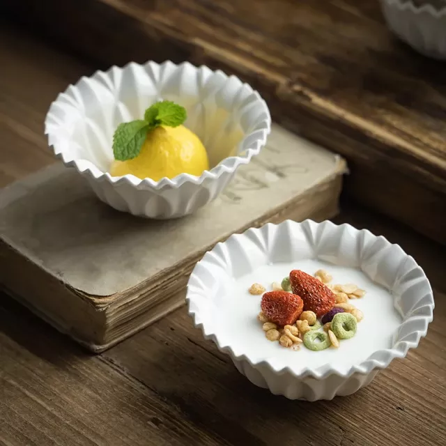 Bring beauty to your table with this simple yet eye-catching ceramic bowl and plate designed in a soft flower shape with gently ruffled edges. Its irregular, handcrafted look adds warmth and character, making every meal feel special. The embossed texture and smooth ceramic finish create a perfect balance between elegance and everyday comfort. Whether you are enjoying a quiet breakfast or serving guests, this piece turns ordinary food into a visual delight.