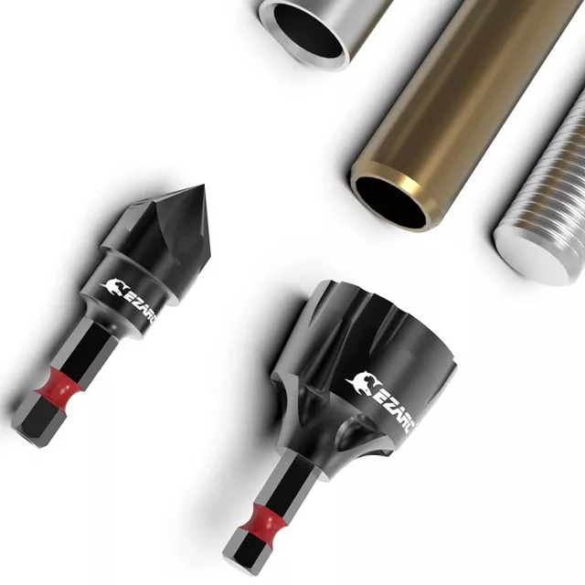 Built for performance, the internal countersink is made from high-speed steel with a heat-treated, black-nitrided surface for strength and wear resistance. The external chamfer head features a tough alloy body with carbide blades that stay sharp longer than standard steel. This means smoother cuts, less effort, and reliable results project after project.