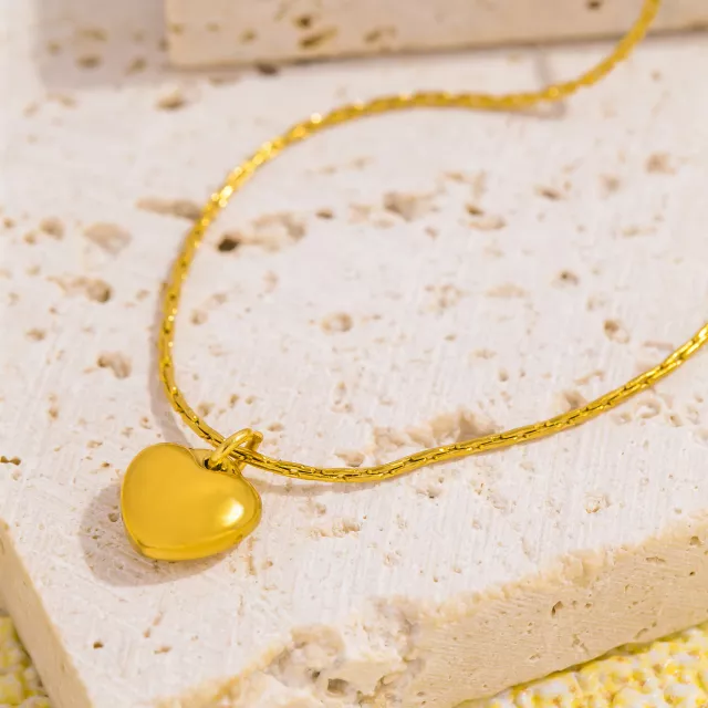 Crafted from durable stainless steel and finished with real gold PVD plating, this necklace is made to keep its shine through everyday life. The smooth heart pendant measures approximately 0.31 inches by 0.31 inches, making it subtle yet eye-catching. The sleek snake chain sits comfortably on the neck and moves fluidly with you, creating a polished look from every angle.