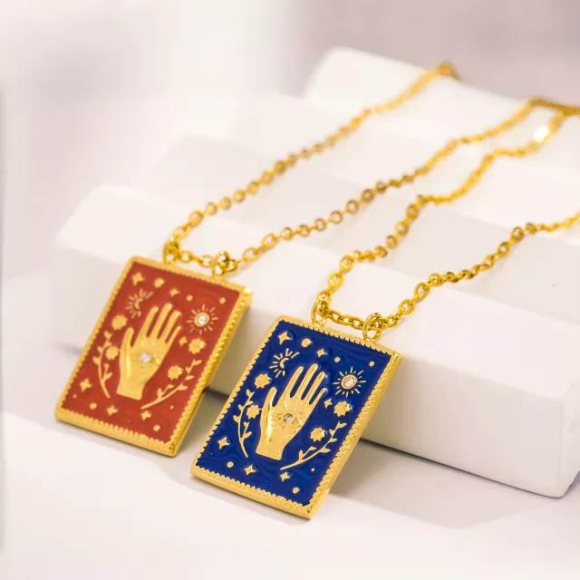 Bring meaning and style together with this beautifully crafted vintage-inspired Hand of Fatima pendant necklace. Designed to feel both classic and contemporary, this piece features a square pendant with colorful enamel detailing and a radiant gold-plated finish. The Hand of Fatima, also known as the Hamsa, is a powerful symbol believed to represent protection, balance, and positive energy. It’s more than jewelry—it’s a statement you can wear every day.